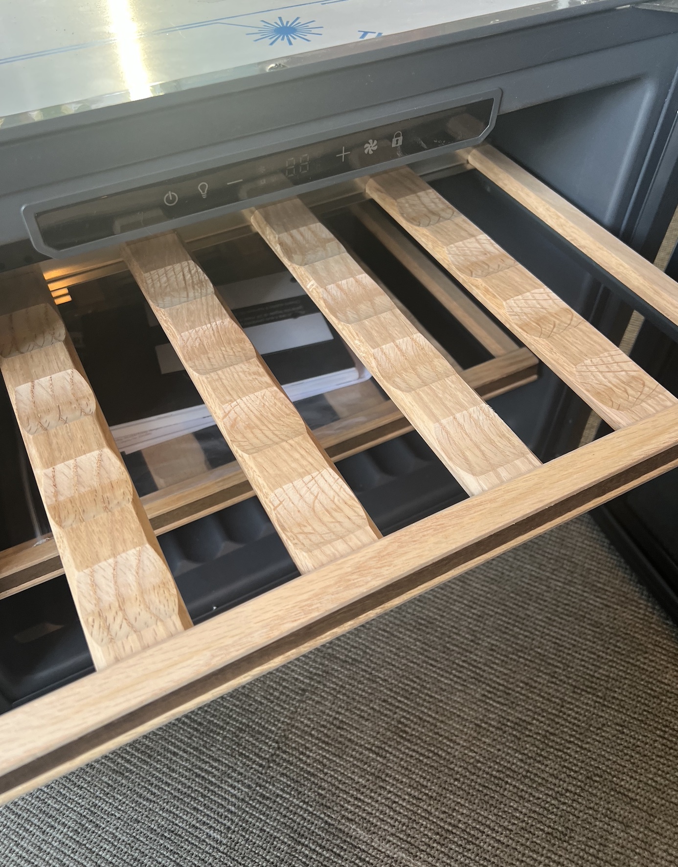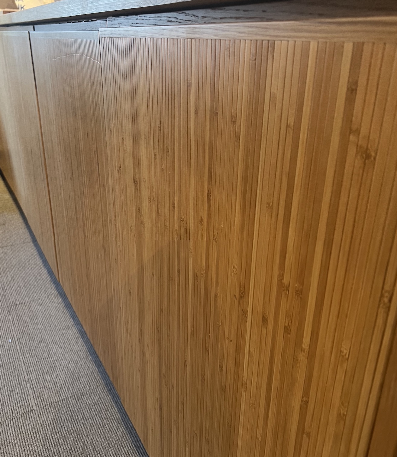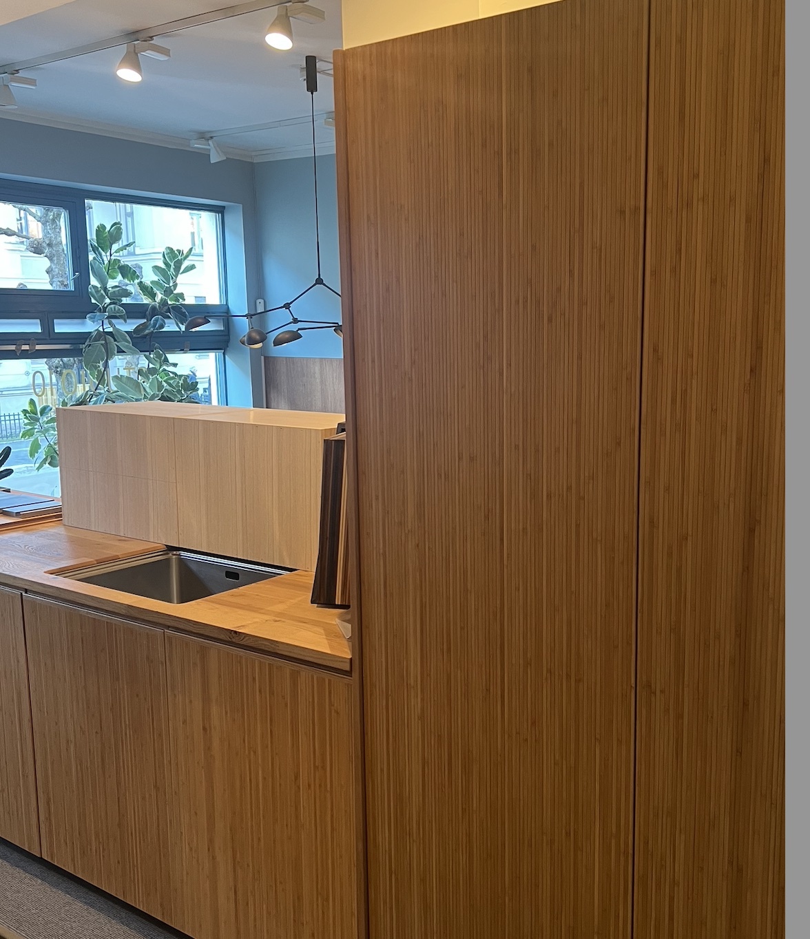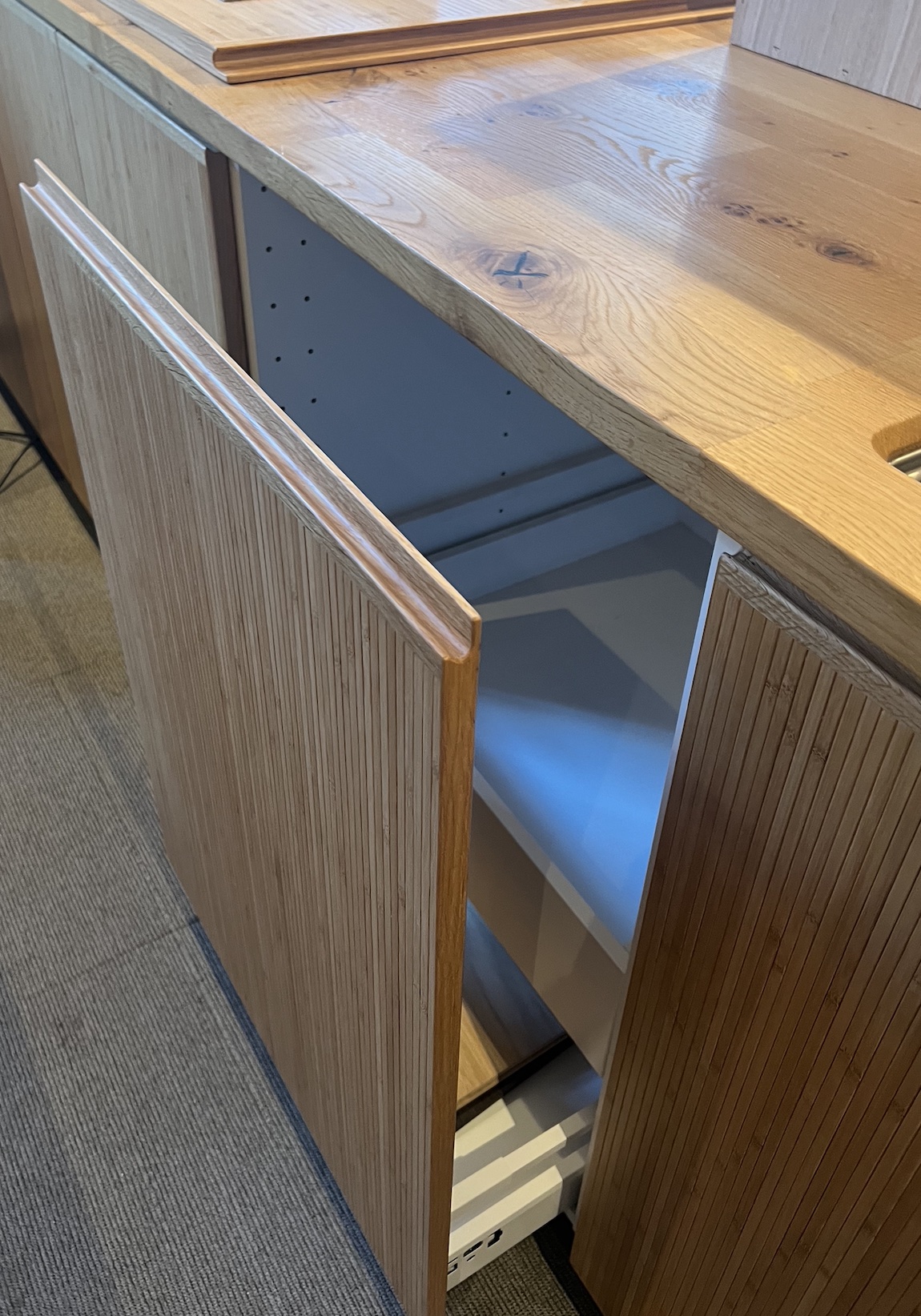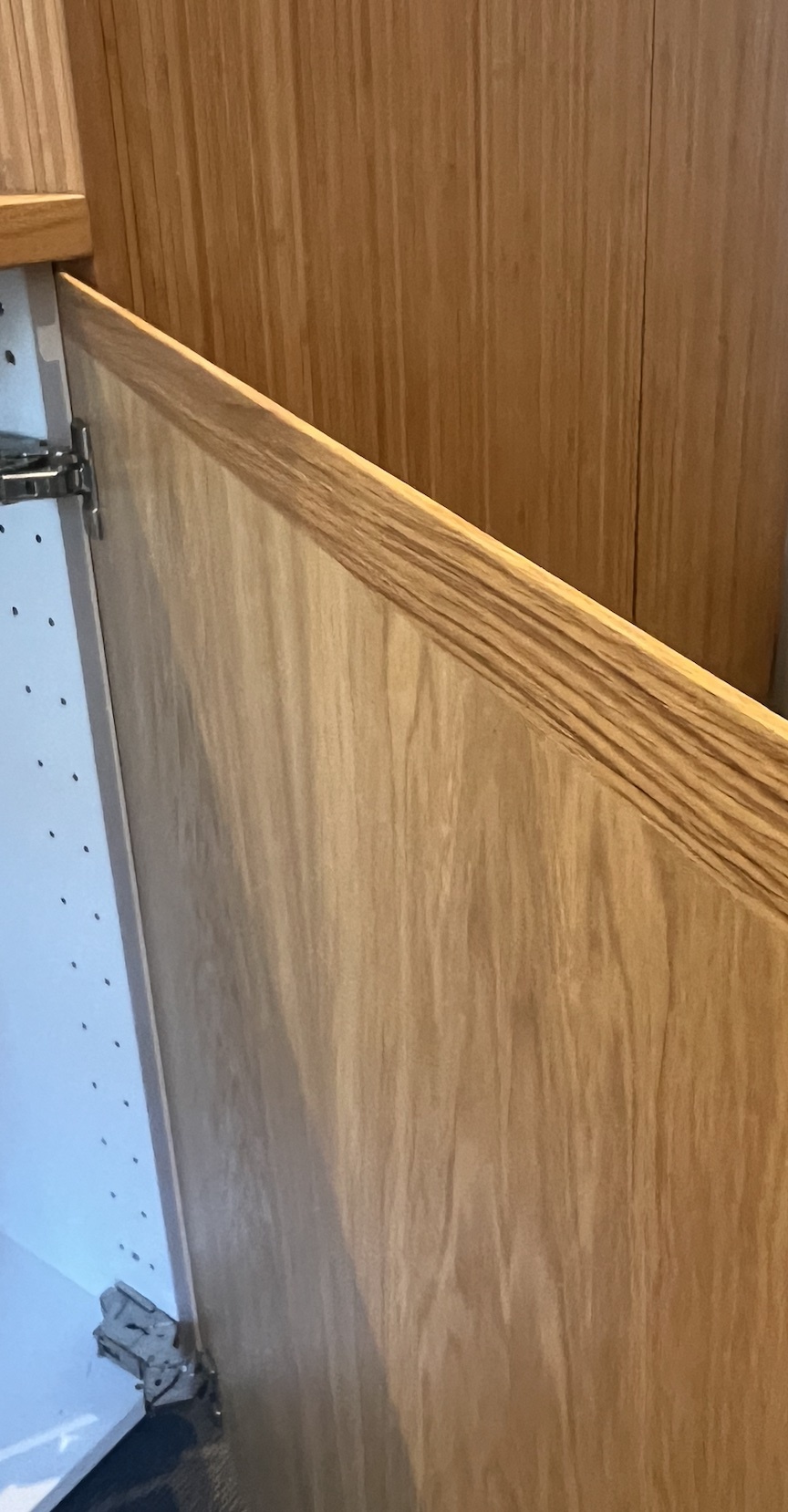 Fronter, dekksider, sokler og hyller er behandlet med mattlakk. Materiale er eikefinert mdf av typen Quercus Allegro. Kjøpt fra Oslo Finer. Alle fronter er glatte, uten håndtak. Foruten dør til kjøl og frys (kombiskap) som har en massiv vertikal gripelist langs hele siden.